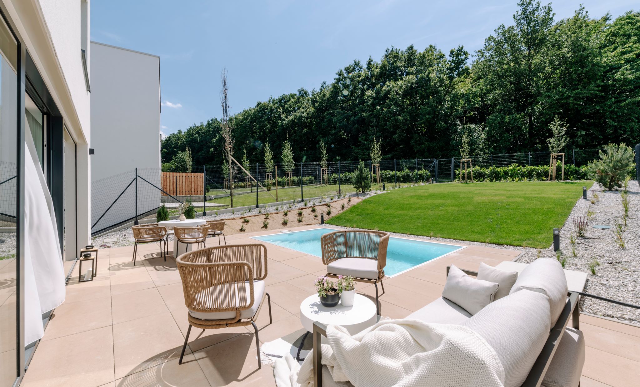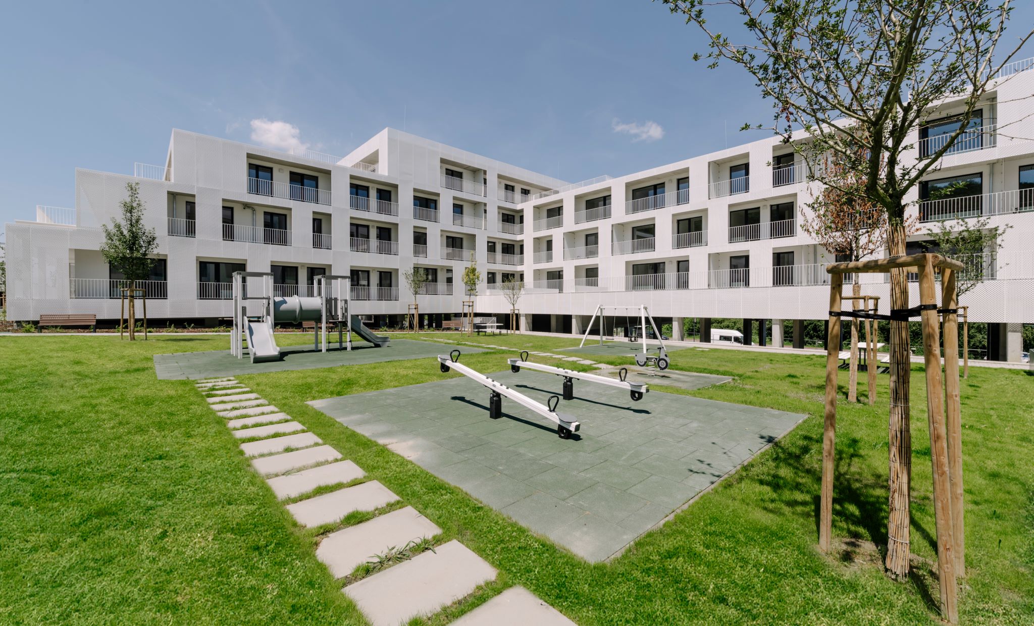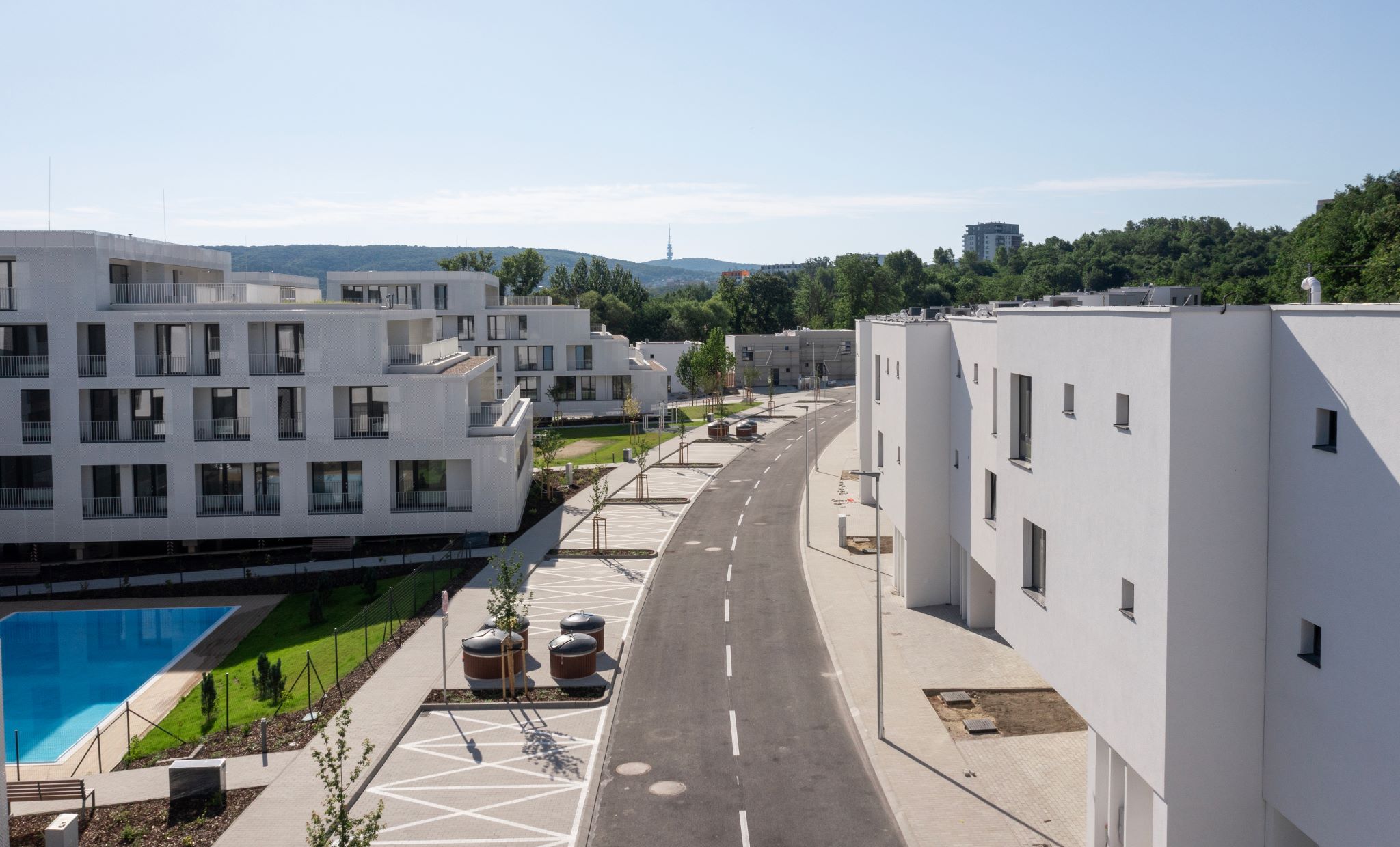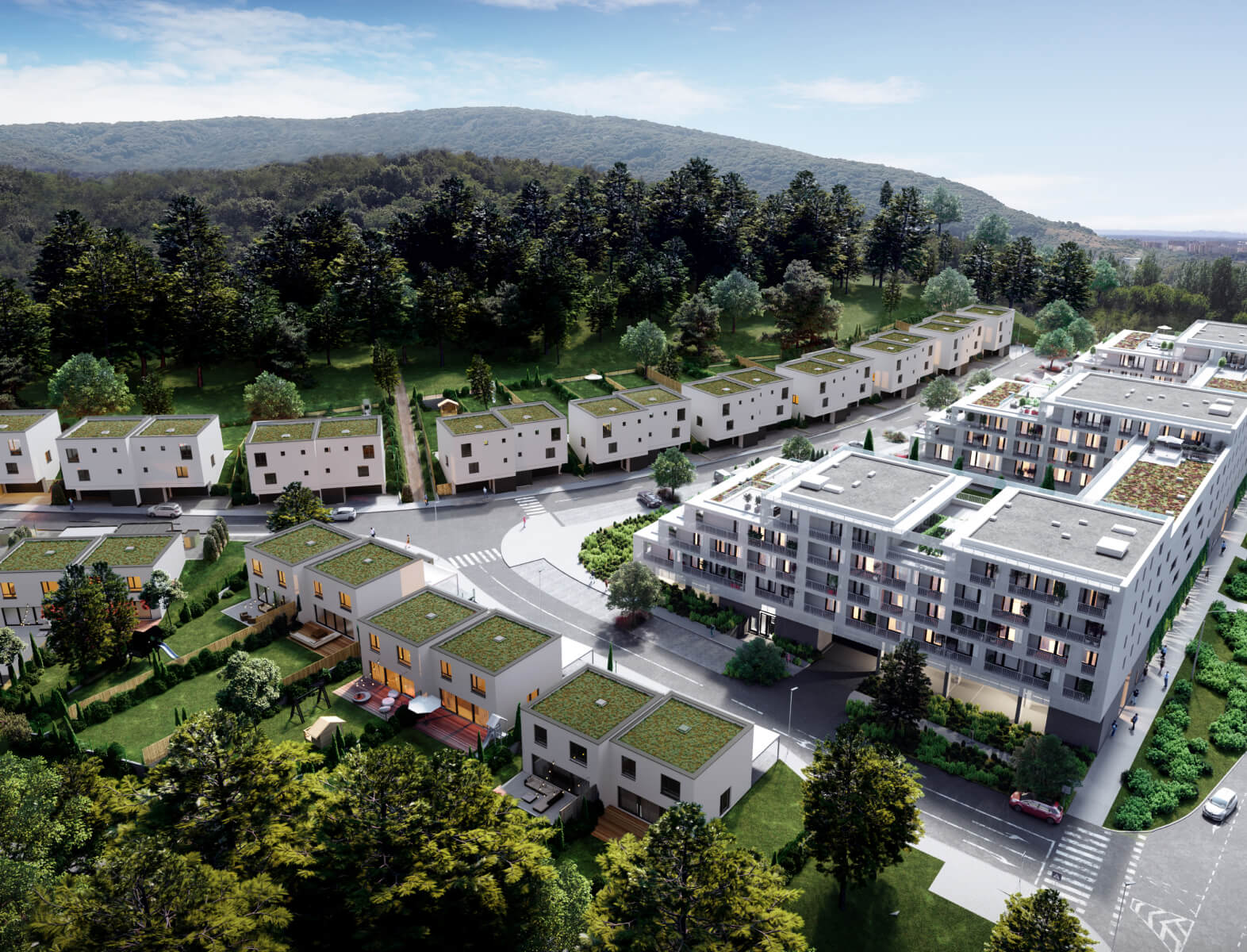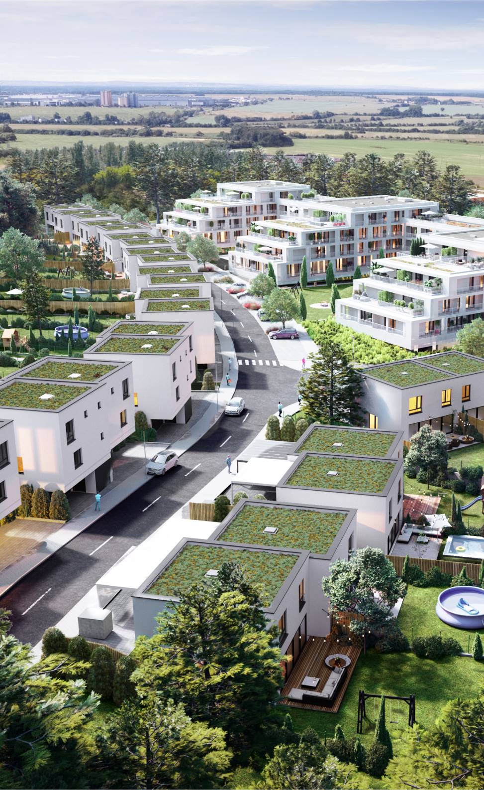 Rodinné domy majú 5 izieb a veľkorysé výmery nad 170 m², pričom sú vybavené terasami, záhradami a garážami. V ponuke sú aj byty rôznych veľkostí, s dostatkom svetla a funkčnými dispozíciami. Výhodou je uzavretý areál so zeleňou, detským ihriskom a jednoduchým napojením na hlavnú mestskú infraštruktúru.