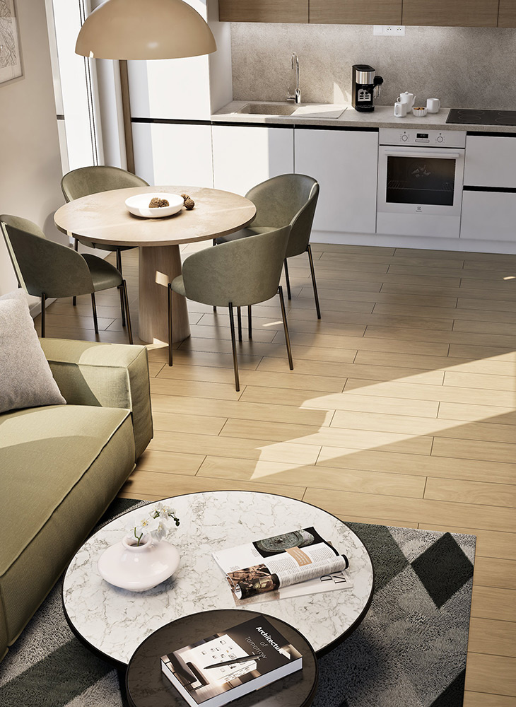 Architektúra projektu stavia na funkčnosti a udržateľnosti. Byty sú navrhnuté s veľkorysými francúzskymi oknami, exteriérovými žalúziami, podlahovým vykurovaním a fancoilovým chladením. Komfort dopĺňajú nabíjacie stanice pre elektromobily. Inteligentný systém prístupu, automatizovaná garáž a kamerový systém zvyšujú pohodlie aj bezpečnosť obyvateľov.