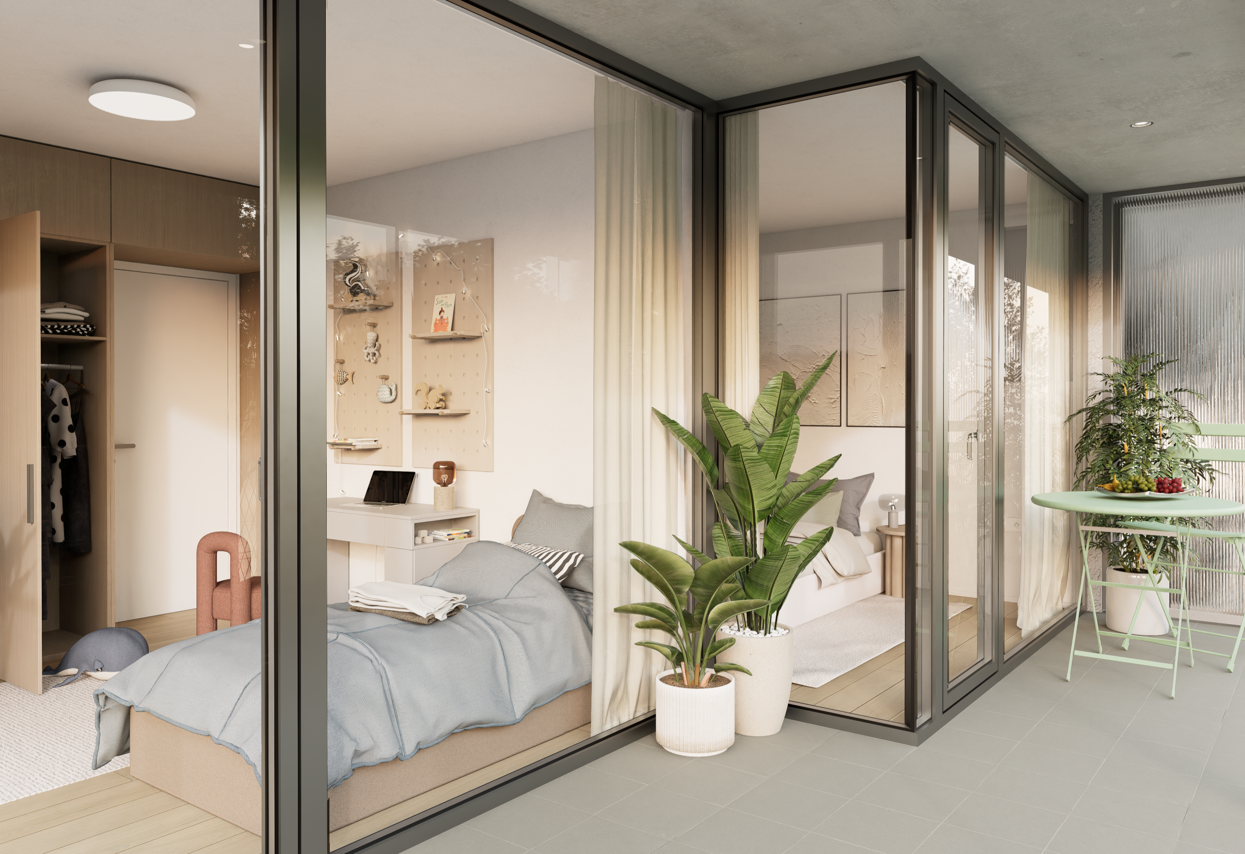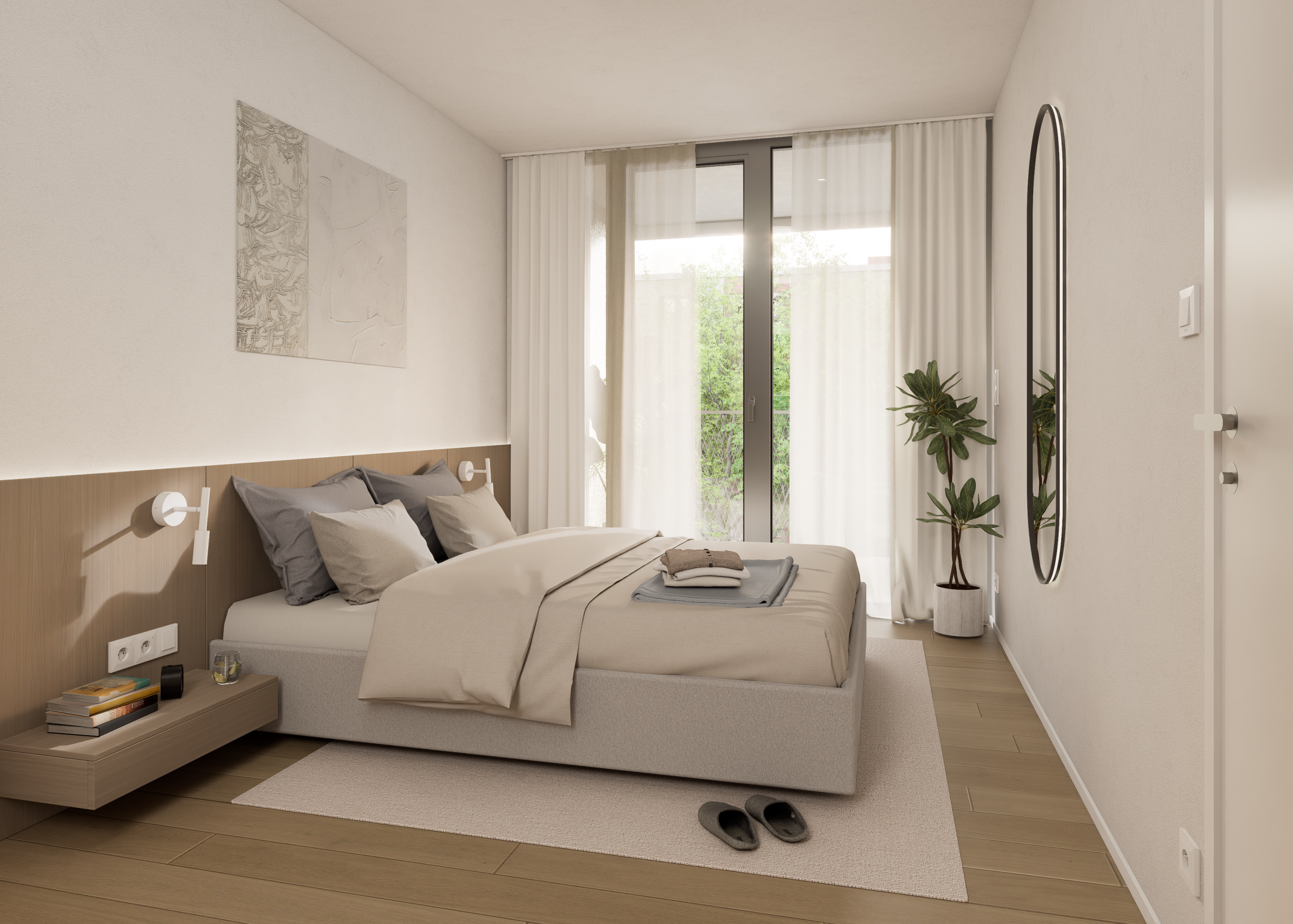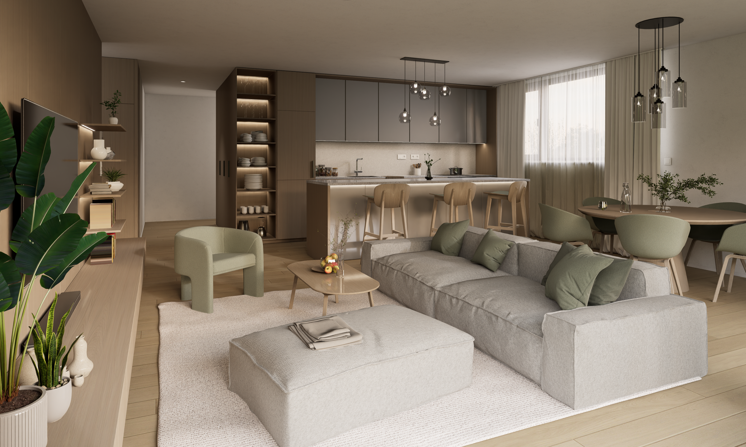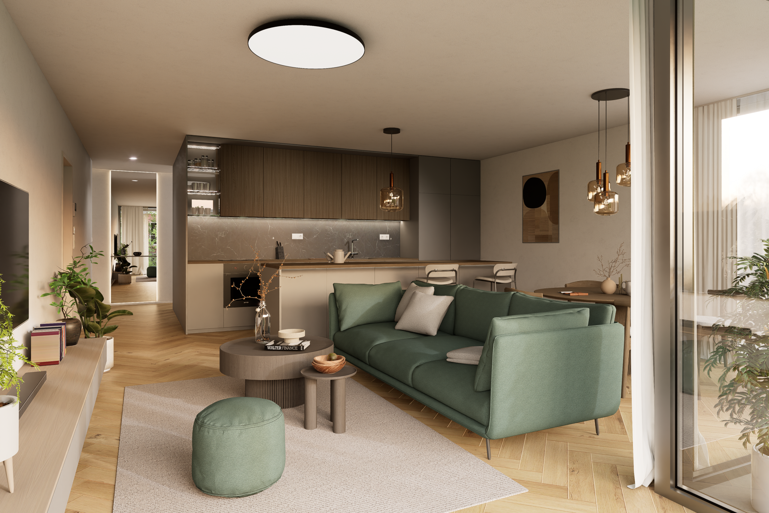 Dispozície bytov sú navrhnuté s dôrazom na vzdušnosť, súkromie a prirodzené presvetlenie. Samozrejmosťou sú priestranné loggie, funkčné úložné riešenia a prepojenie interiéru s exteriérom. Interiéry ponúkajú drevené podlahy, veľkoformátové obklady a kvalitnú sanitu. Štandard zahŕňa stropné kúrenie a chladenie, rekuperáciu, smart tienenie a fotovoltiku.