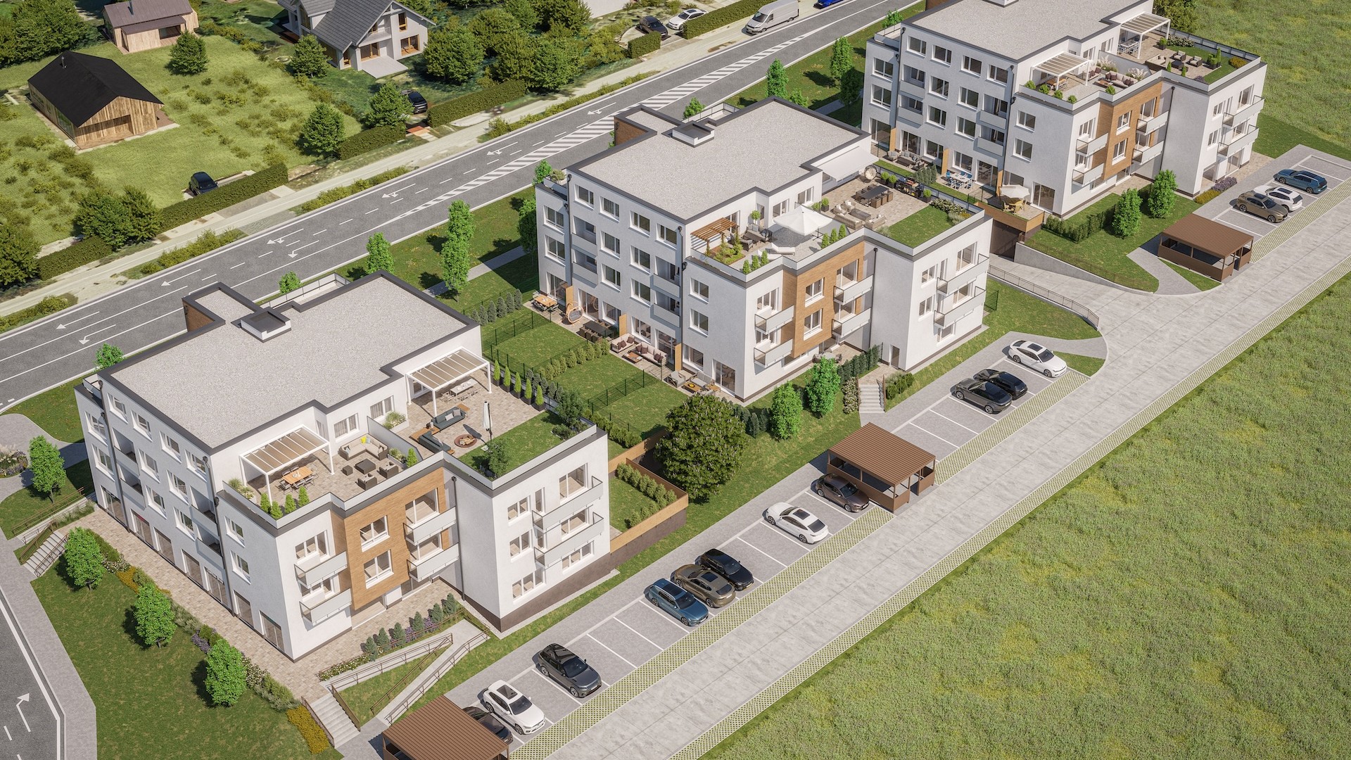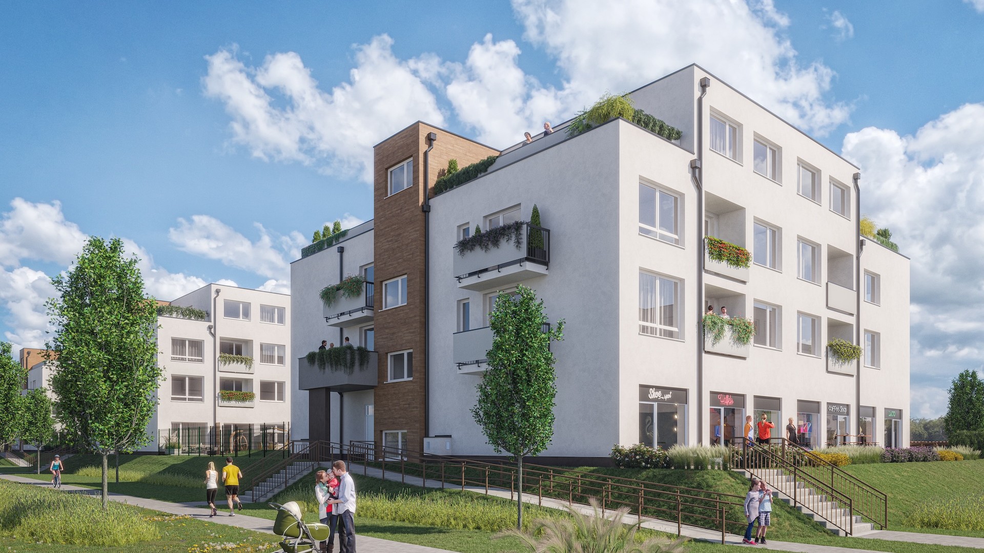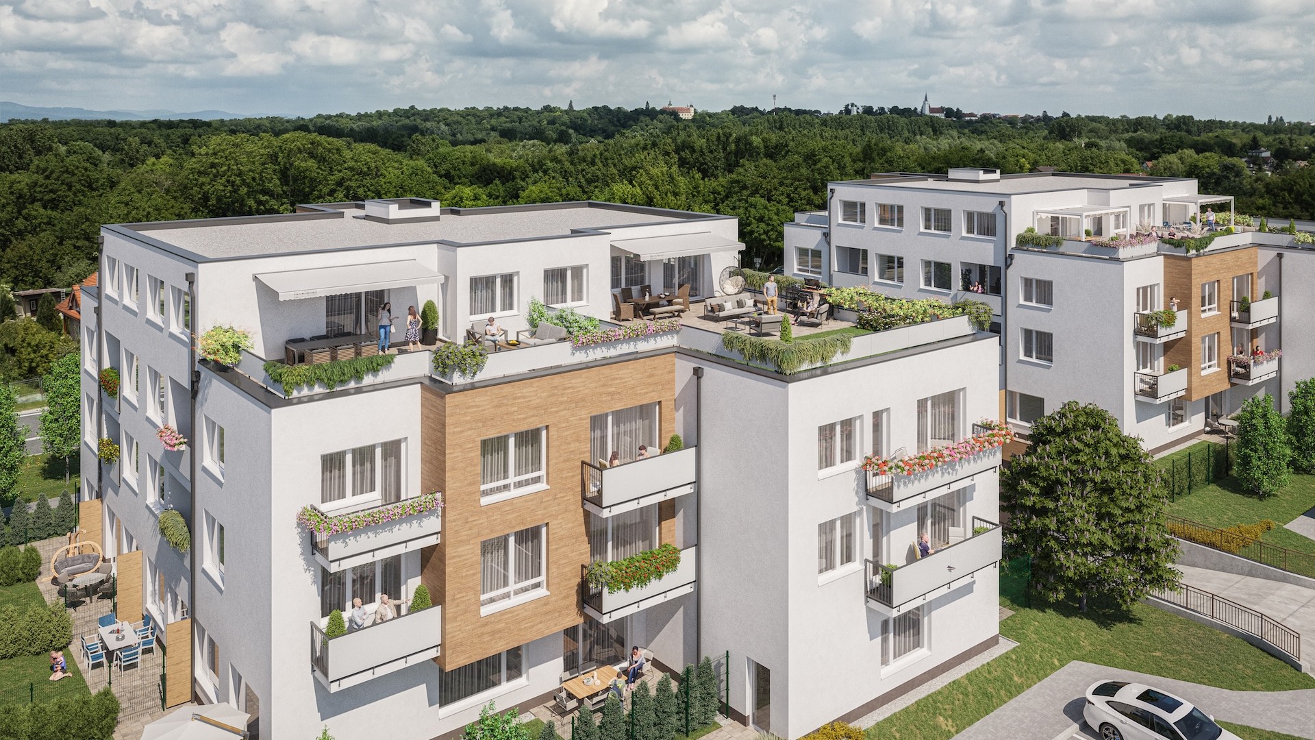 V rámci projektu bude vysadených 130 dubov a brestov, ktoré vytvoria príjemné prostredie na prechádzky a oddych. Súčasťou areálu je aj detské ihrisko, ktoré poskytne bezpečný priestor na hranie priamo pod oknami bytov. Parkovanie je zabezpečené v podzemnej garáži aj na vonkajších státiach, s možnosťou odloženia platby za garážové miesto až do roka po kolaudácii.