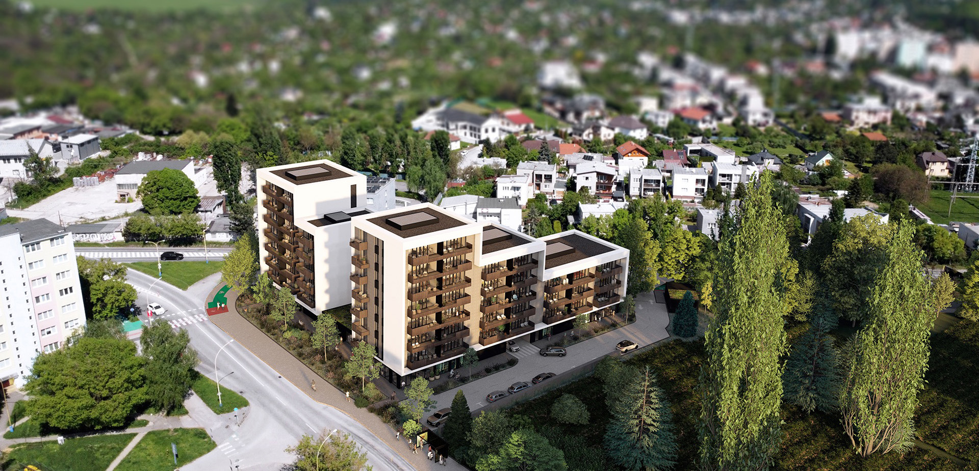 Dispozície sú premyslené s dôrazom na funkčnosť, presvetlenie a komfort. K bytom patria loggie alebo terasy s výmerou až do 19 m², čo zvyšuje kvalitu vnútorného priestoru. Architektonický návrh stavia na kontraste svetlej fasády a drevených prvkov, ktoré projektu dodávajú teplý a mestský charakter.