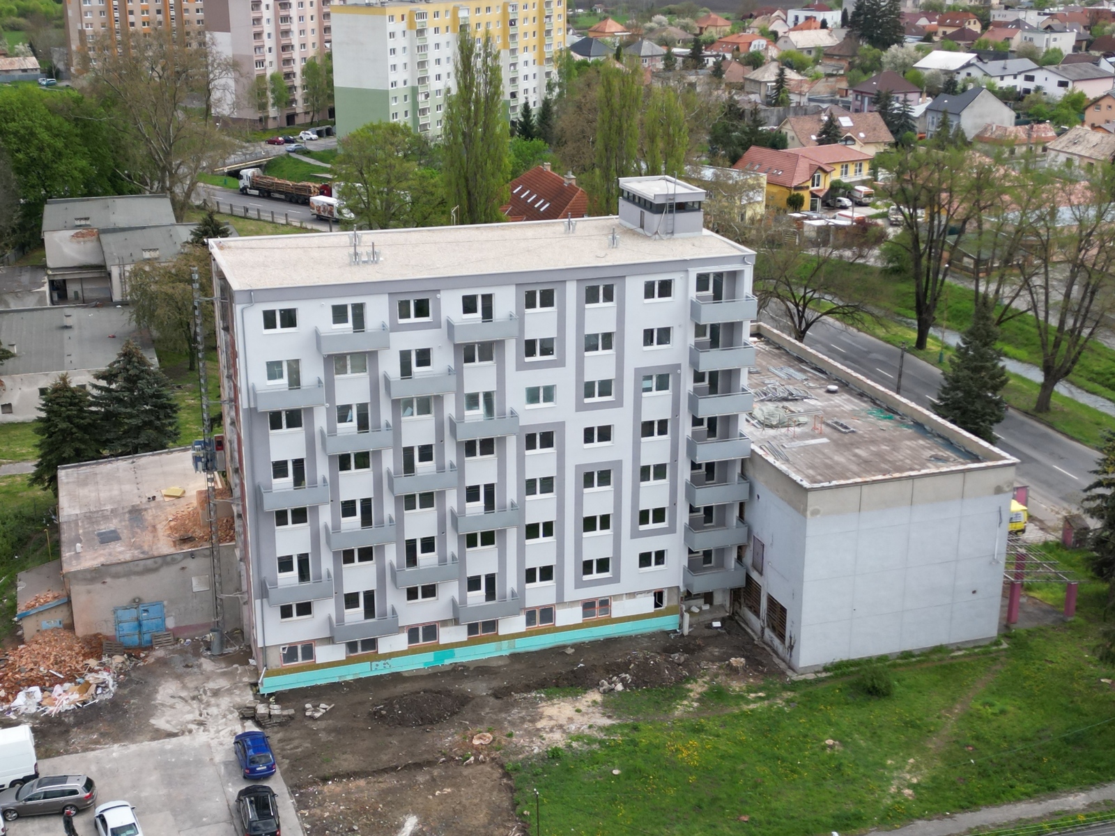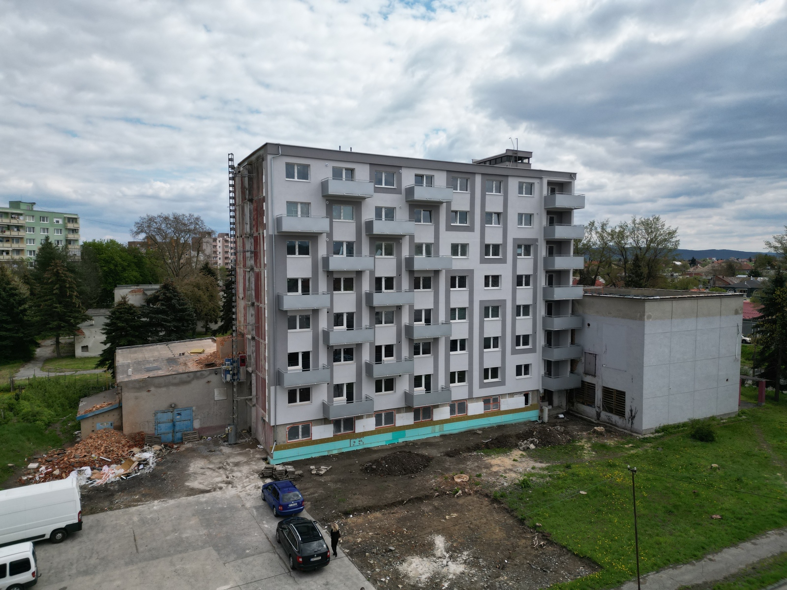 Na opačnej strane bytového domu, ako sú umiestnené parkoviská, sa plánuje vybudovať trávnik s lavičkami a preliezkami, čo poskytne obyvateľom priestor na oddych a relaxáciu.