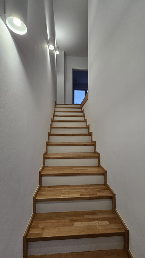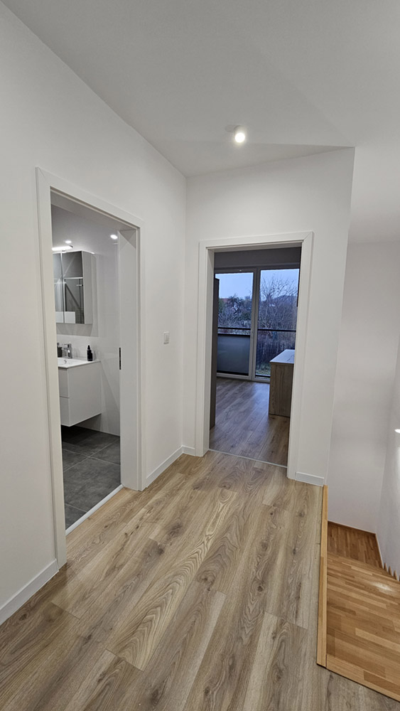 Byty sú riešené ako dvojpodlažné, pričom spodné poschodie je orientované na spoločenský život – otvorená kuchyňa so spotrebičmi, jedáleň spojená s obývačkou, chodba so šatníkovou zostavou, hosťovské WC a technická miestnosť s plynovým kotlom. Horné podlažie je venované súkromiu: spálňa, detská izba a kúpeľňa s vaňou, sprchovým kútom a WC.